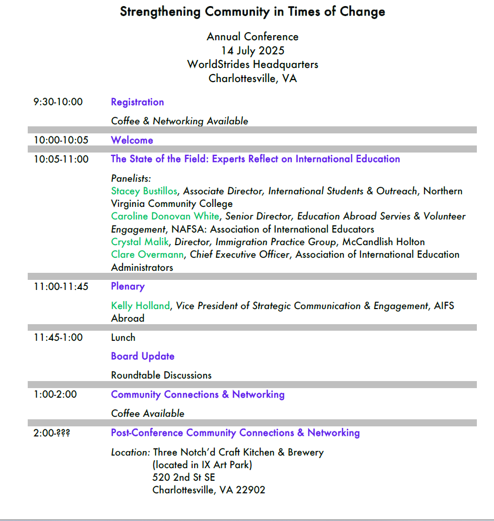 Join us for a day of learning, connection, and engagement based on the theme Strengthening Community in Times of Change. Much has changed since the last time we were together in-person, so the focus of our time together will be a little different than conferences past. Rather than a series of sessions proposed by members, this conference will challenge attendees to consider the current state of the field, to contemplate how international educators can best respond to the challenges of the day, to collaborate on proposed solutions, to bolster our each other for future success, and to engage with other professionals in the field.